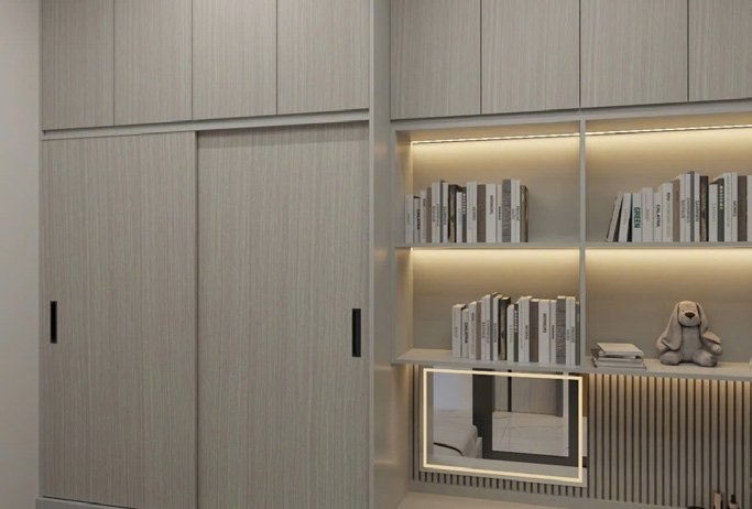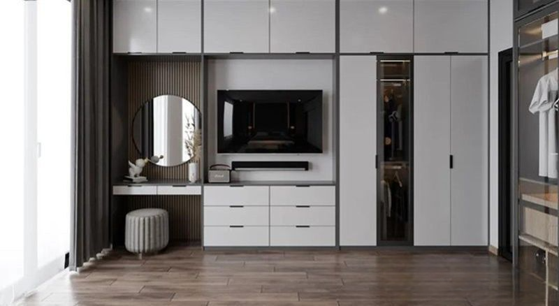 Chia nhiều khoảng lớn, có thể sử dụng cửa lùa hoặc cửa mở, bao gồm nhiều thanh treo, ngăn kệ và phá kéo để sắp xếp quần áo, chăn màn, vali một cách khoa học và gọn gàng.